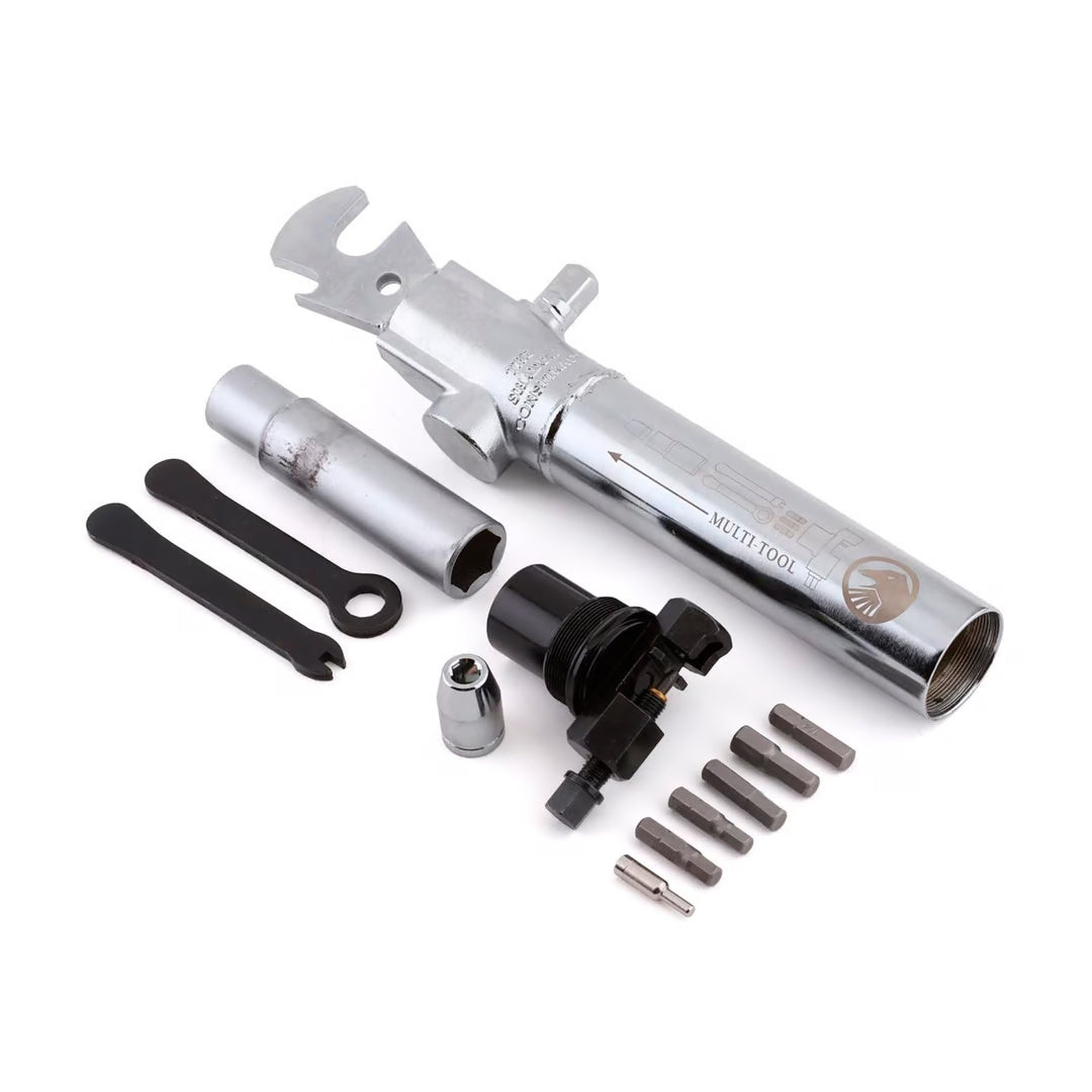 La multiherramienta Shadow es una herramienta compacta de acero fundido, forjado y construida con CNC que contiene casi cualquier herramienta que pueda necesitar para los contratiempos diarios de conducción. Incluye un rompecadenas Interlock, un vaso de 17 mm de profundidad, una llave para pedales, una llave de 10 mm, una llave para radios, desmontables para llantas, llaves hexagonales de 8 mm, 6 mm, 5 mm, 1/4 ″, 7/32 ″, un martillo y, por supuesto, una botella. abrelatas. Todo en una herramienta que pesa 33,6 onzas y que es perfecta para guardar en la mochila. No te quedes atrapado en ningún lugar sin él.