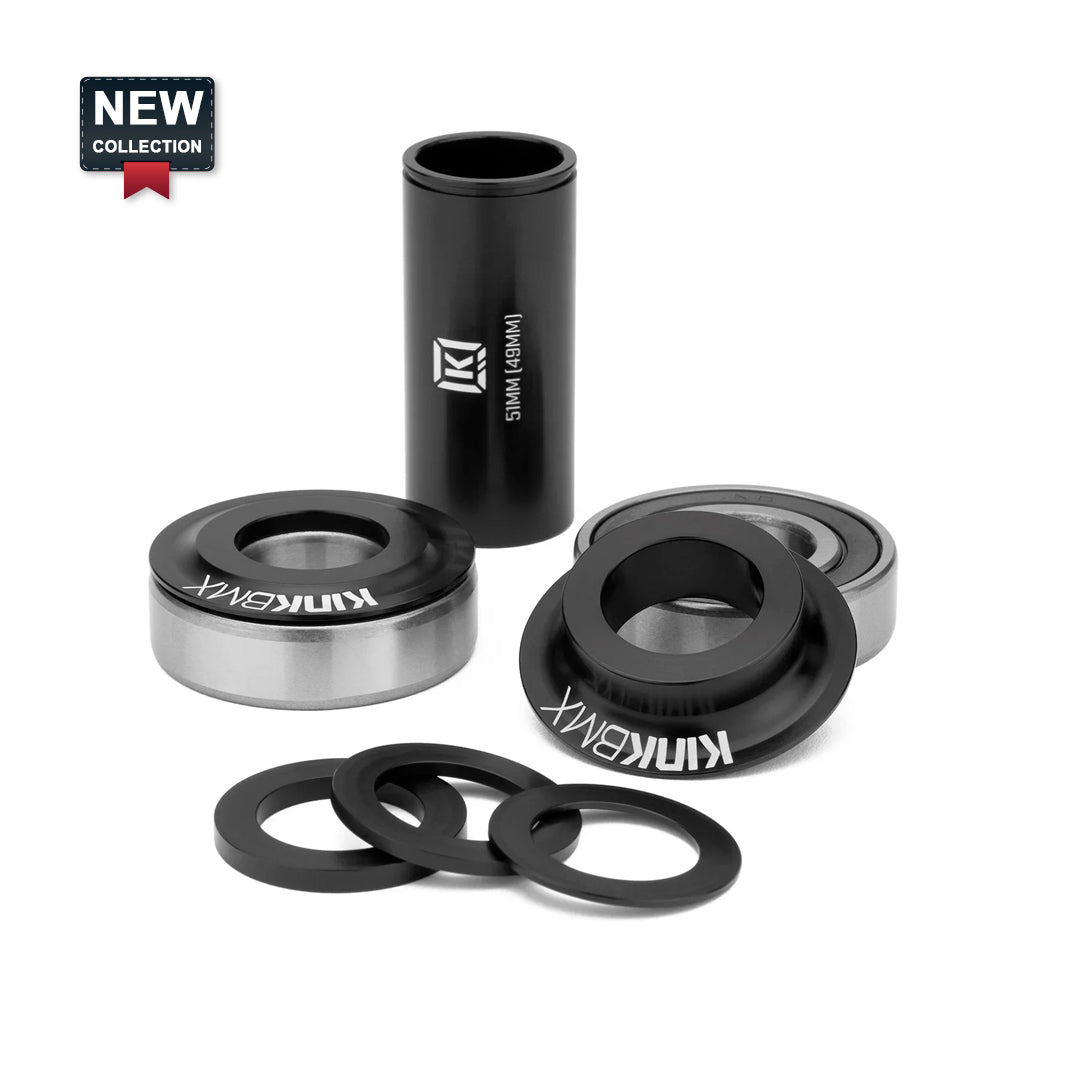 Los kits de bb Kink incluyen rodamientos sellados de precisión, conos de protección antipolvo mecanizados y todos los espaciadores necesarios para una alineación perfecta de los cranks y la cadena. El espaciador del tubo central tiene un ancho estándar de 51 mm, por lo que no se necesitan espaciadores internos adicionales. Si su cuadro requiere un espaciador central de 49 mm, puede recortarlo utilizando la guía de corte mecanizada en el espaciador.